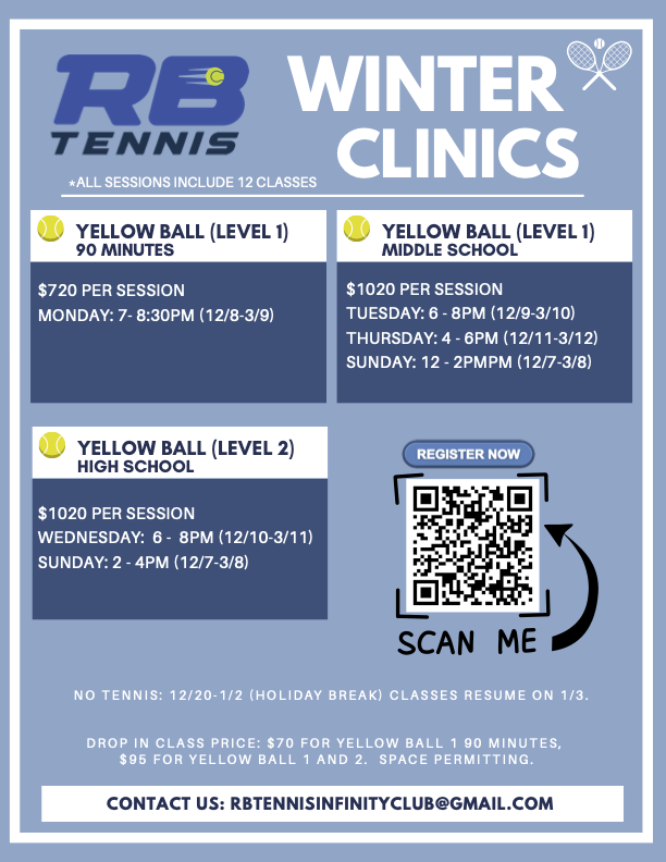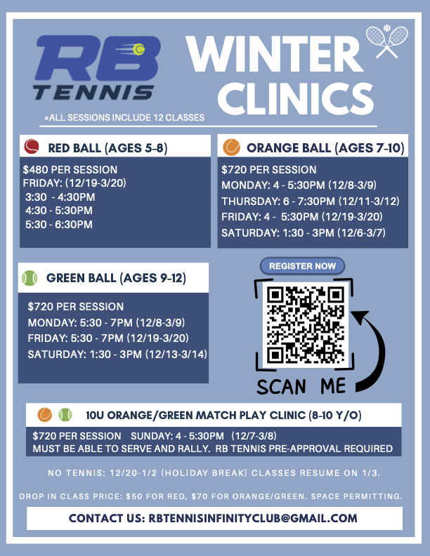 RB Tennis Club reserves the right to make final program placement. You will be contacted if we feel a change in program is necessary.